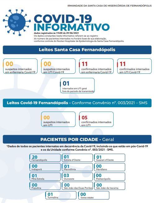 Os dados constantes no informativo referem-se ao registro do número de pacientes internados no horário base de sua elaboração, conforme controle do Núcleo Hospitalar de Epidemiologia da Santa Casa Fernandópolis.