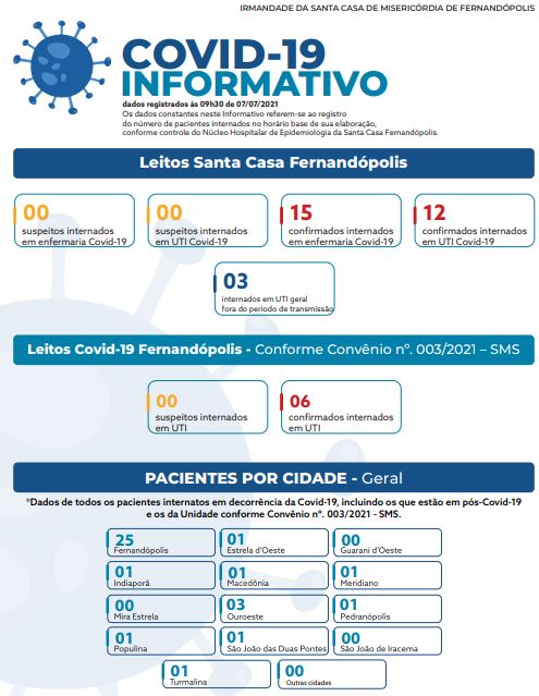 Os dados constantes no informativo referem-se ao registro do número de pacientes internados no horário base de sua elaboração, conforme controle do Núcleo Hospitalar de Epidemiologia da Santa Casa Fernandópolis.