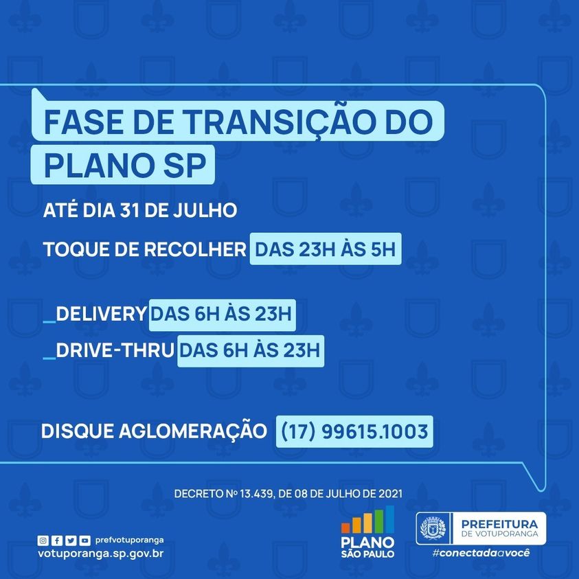 O Governo de São Paulo anunciou ampliação dos horários de funcionamento de estabelecimentos a partir desta sexta-feira (9/7) pela Fase de Transição do Plano SP, e Votuporanga segue as novas regras estaduais de acordo com o Decreto Municipal nº 13.439, publicado no Diário Oficial Eletrônico desta quinta-feira (8/7). Para elaborar o Decreto, o prefeito Jorge Seba seguiu orientações e recomendações do Comitê de Enfrentamento à Covid de Votuporanga.