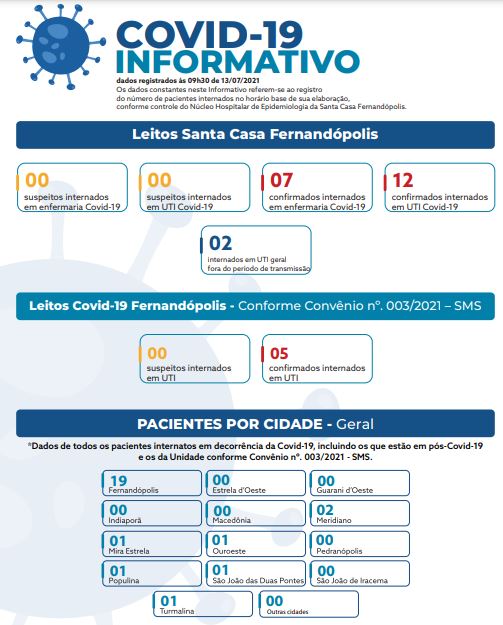 Os dados constantes no informativo referem-se ao registro do número de pacientes internados no horário base de sua elaboração, conforme controle do Núcleo Hospitalar de Epidemiologia da Santa Casa Fernandópolis.