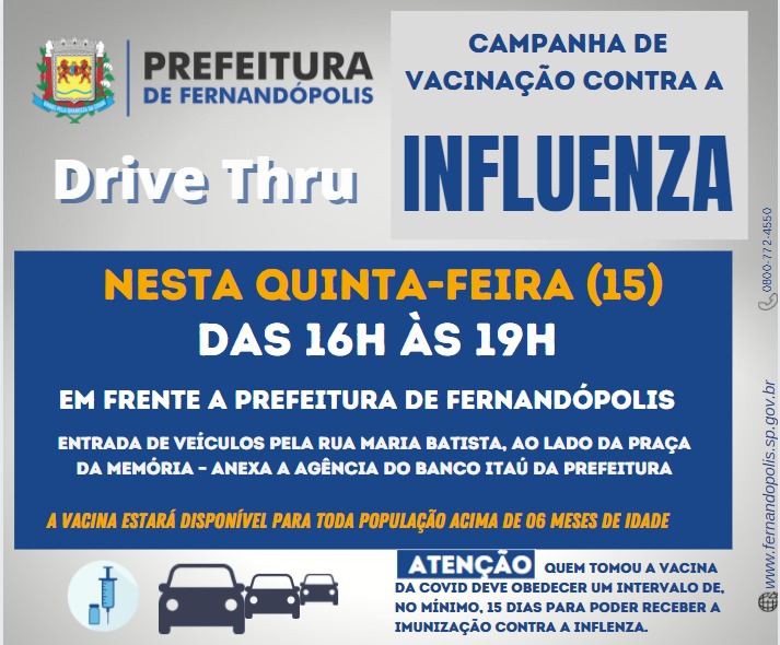 Para encerrar a campanha, nesta quinta-feira, 15, um novo drive será realizado, atendendo as pessoas que ainda não foram imunizadas. O atendimento será feito das 16h às 19h em frente à Prefeitura, com entrada de veículos pela Rua Maria Batista, ao lado da Praça da Memória – anexa a agência do Banco Itaú da Prefeitura.