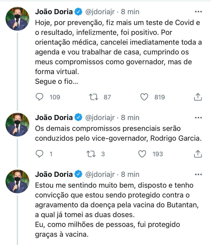 "Hoje, por prevenção, fiz mais um teste de Covid e o resultado, infelizmente, foi positivo. Por orientação médica, cancelei imediatamente toda a agenda e vou trabalhar de casa, cumprindo os meus compromissos como governador, mas de forma virtual", escreveu ele no Twitter.