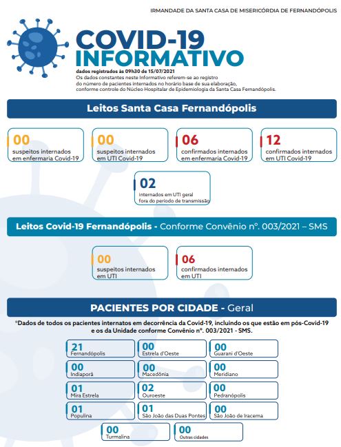 Os dados constantes no informativo referem-se ao registro do número de pacientes internados no horário base de sua elaboração, conforme controle do Núcleo Hospitalar de Epidemiologia da Santa Casa Fernandópolis.