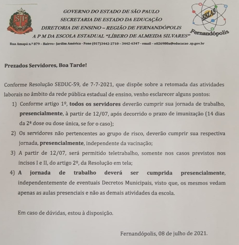 Convocação gerou polêmica em Fernandópolis: item 2 de documento emitido pela direção da EELAS diz que professores devem retomar atividades presenciais “independente de vacinação”: Seduc avaliza ação no município, professores protestam e Apeoesp defende que “profissionais comuniquem por escrito que só voltam depois de 14 dias após receberem a 2ª dose do imunizante contra o vírus”