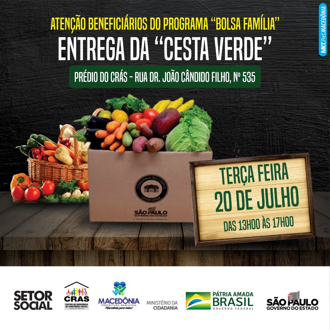A Prefeitura de Macedônia, através de parceria com o Ministério da Cidadania e Secretaria de Agricultura e Abastecimento do Estado de São Paulo, com o Setor Social e CRAS, fará nesta terça-feira, 20, das 13h às 17h, a entrega da "Cesta Verde'.