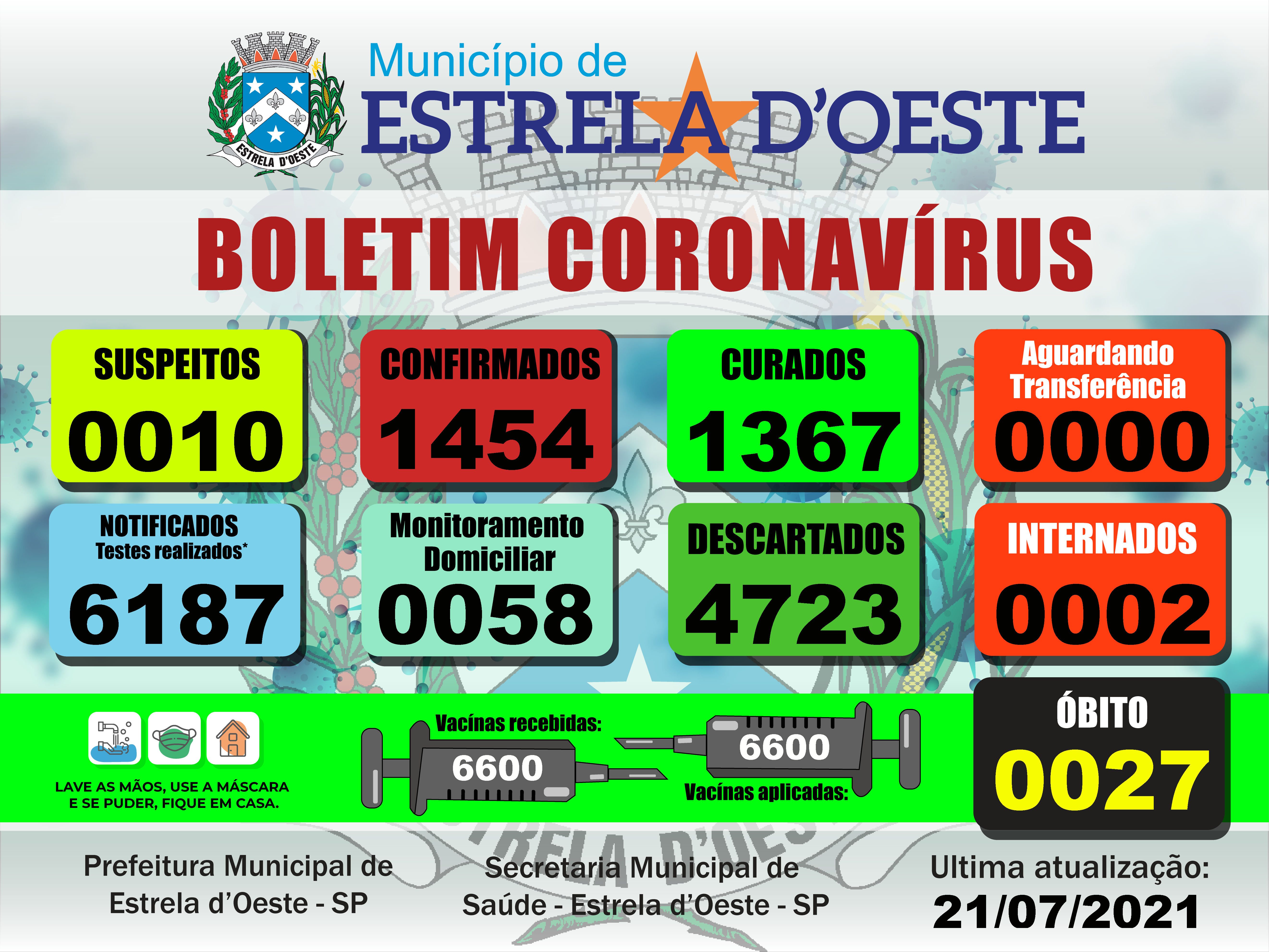 Estrela d´Oeste, município localizado a 17 quilômetros de Fernandópolis, registrou mais casos positivos de coronavírus (Covid-19), nesta quarta-feira, dia 21, de acordo com o boletim epidemiológico, divulgado pela Prefeitura.