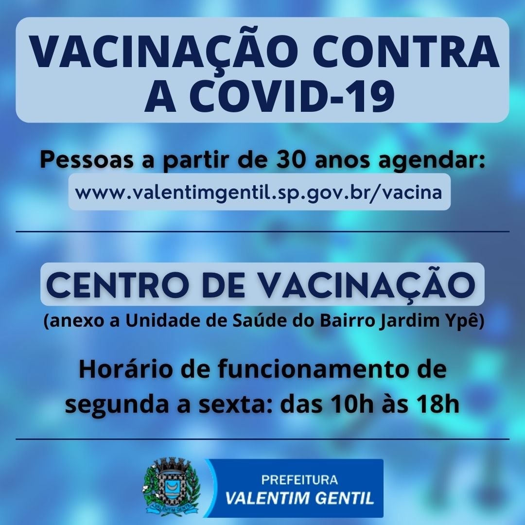 A vacina é aplicada mediante agendamento. Os munícipes que fazem parte do público alvo, devem acessar o site www.valentimgentil.sp.gov.br/vacina. Os agendamentos são abertos diariamente, de acordo com a disponibilização de doses, às 18h.