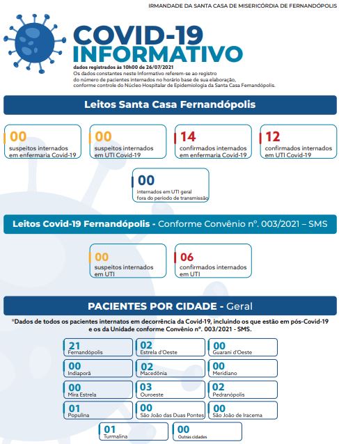 Os dados constantes no informativo referem-se ao registro do número de pacientes internados no horário base de sua elaboração, conforme controle do Núcleo Hospitalar de Epidemiologia da Santa Casa Fernandópolis.