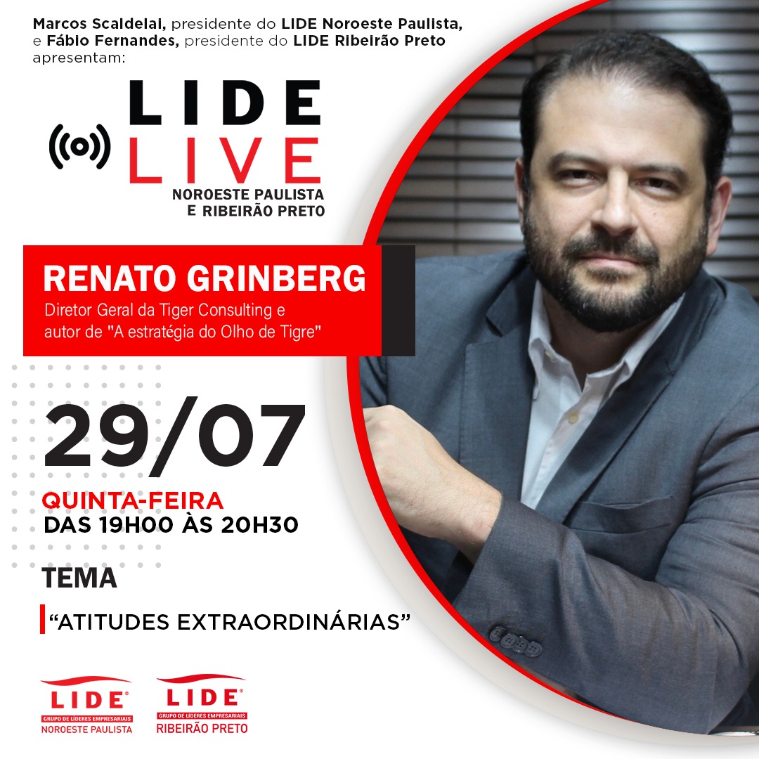 Autor de vários best-sellers e Diretor-geral da Tiger Consulting, Renato Grinberg, participa na próxima quinta-feira, 29 de julho, de live com filiados LIDE Noroeste Paulista para abordar o tema "Atitudes Extraordinárias".