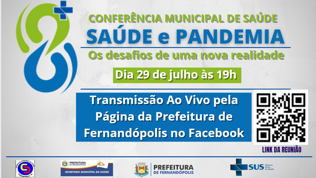 Em Fernandópolis, com o tema ‘Saúde e Pandemia - Os Desafios da Nova Realidade’, o Conselho Municipal de Saúde realiza nesta quinta-feira, dia 29, a partir das 19h, a 8ª Conferência Municipal de Saúde. Para participar, os delegados receberão um link para o acesso, tendo direito a voto e a voz.