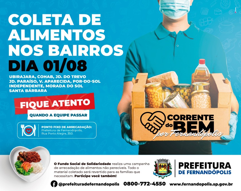 Com o objetivo de arrecadar alimentos e reverter em cestas básicas, o Fundo Social de Solidariedade da Prefeitura de Fernandópolis promove pelo segundo domingo consecutivo, uma Campanha de Arrecadação de Alimentos que percorrerá diversos bairros da cidade.