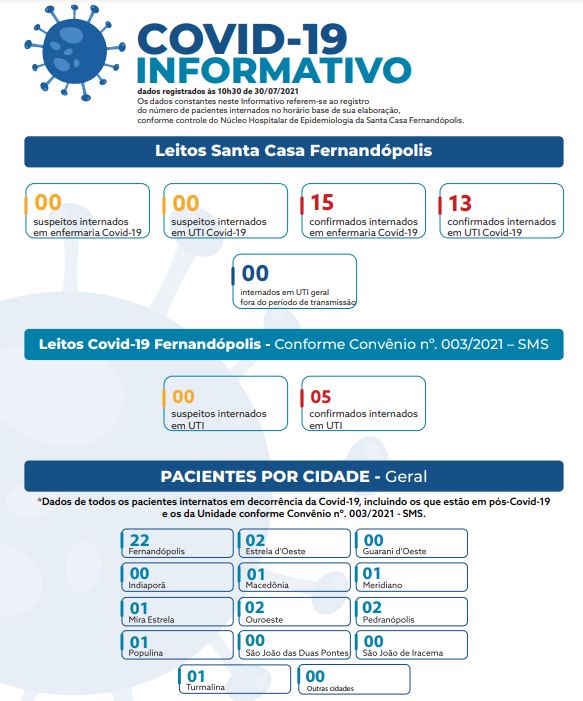 Os dados constantes no informativo referem-se ao registro do número de pacientes internados no horário base de sua elaboração, conforme controle do Núcleo Hospitalar de Epidemiologia da Santa Casa Fernandópolis.