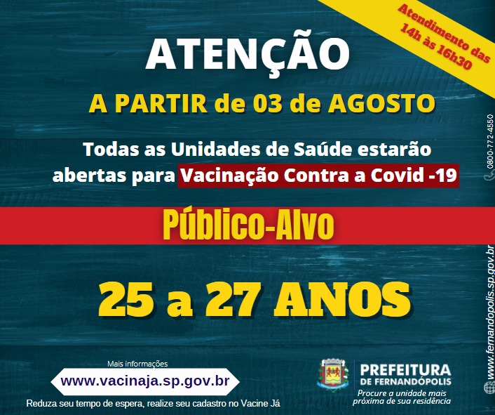 A Prefeitura de Fernandópolis inclui um novo público-alvo na campanha de vacinação contra a Covid-19 essa semana. Conforme calendário da Secretaria Estadual de Saúde, passam a ser imunizadas a partir desta terça-feira,03, a população de 25 a 27 anos.