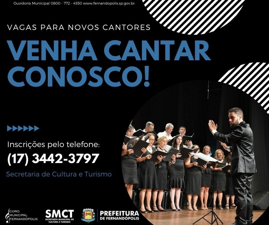 Sob a regência do maestro Sandro Muniz, o Coro Municipal de Fernandópolis se prepara para o retorno de suas atividades, com vagas abertas para novos cantores. As inscrições para novos cantores podem ser feitas pelo link: https://forms.gle/yU9HTR8GL5GXsRob7, ou pelo telefone 3442-3797.