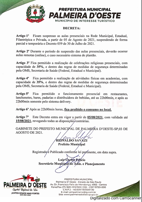 "O momento é de pensar em salvar vidas. Não vou agradar a todos, mas estou pensando na saúde, principalmente das crianças, das pessoas com comorbidades e de todos aqueles que estão preocupados com o Covid-19!", declarou o prefeito Reinaldo Savazi.