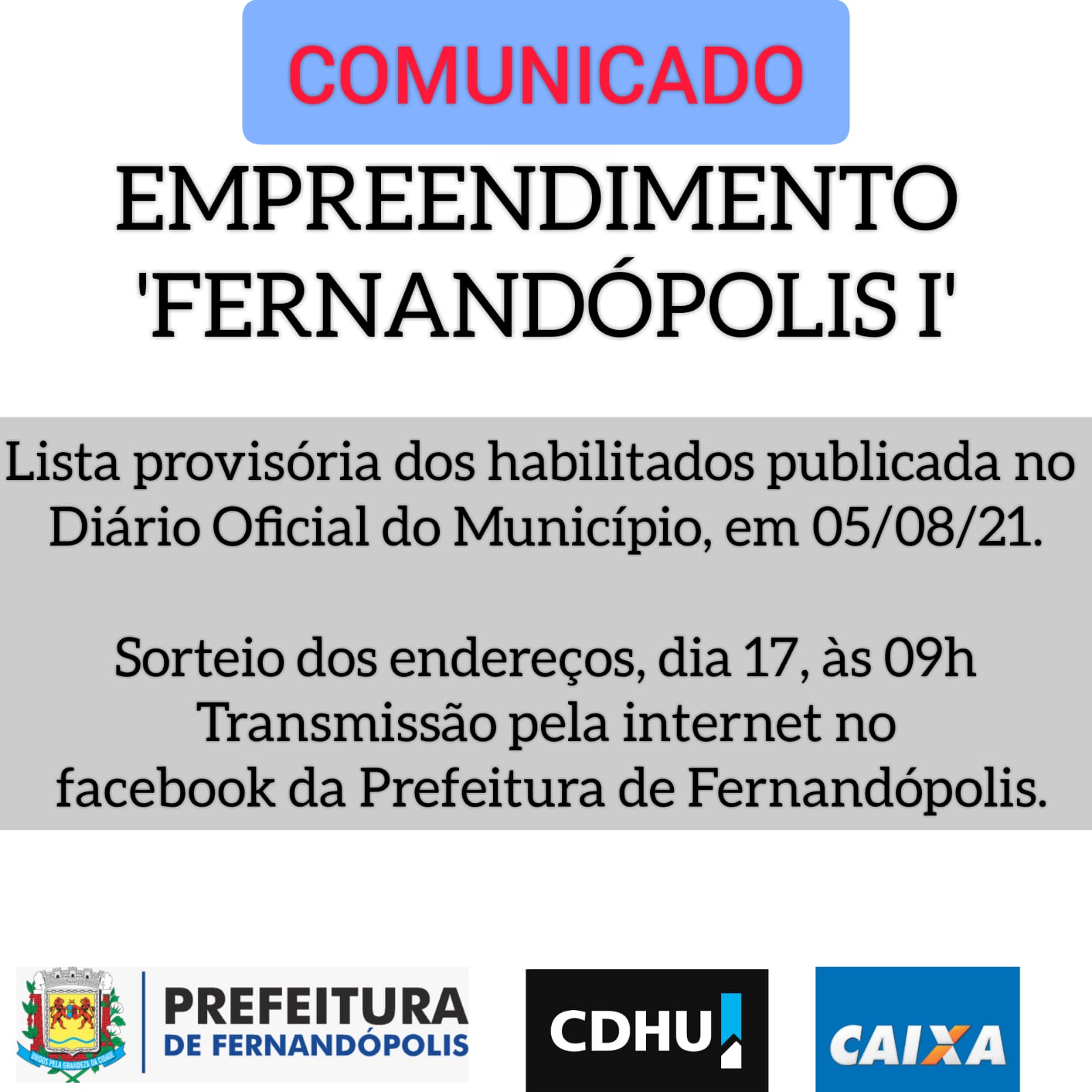 O sorteio será conduzido pela CDHU - Companhia de Desenvolvimento Habitacional e Urbano, com apoio da Prefeitura de Fernandópolis e acompanhamento da Caixa Econômica Federal.