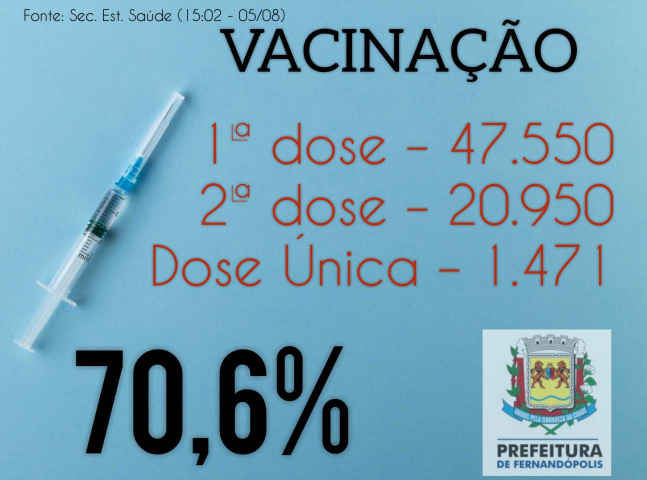 A vacinação contra a Covid-19 no município de Fernandópolis segue atingindo bons índices. Nesta quinta-feira, 05, de acordo com os números oficiais do site www.vacinaja.sp.gov.br, a cidade chegou a 70,6% da população vacinada, sendo “47.550 - 1ª dose aplicada”, // “20.950 - 2ª dose aplicada” e “1.471 – doses únicas.