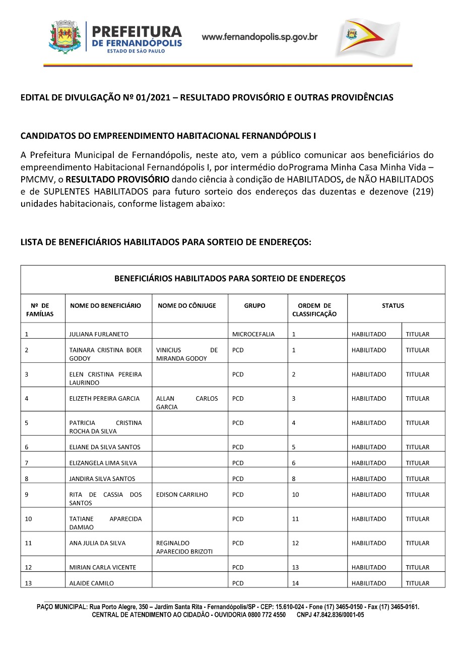 A prefeitura de Fernandópolis acaba de publicar o edital com a lista dos 219 aprovados que realizarão o aguardado sonho da casa própria.