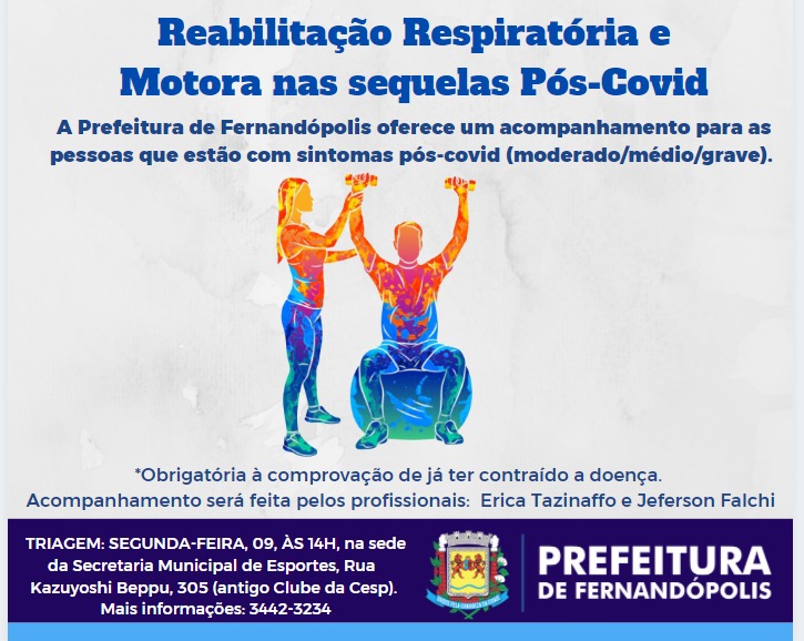 Justamente visando oferecer esse acompanhamento para os pacientes que já se recuperaram da doença, mas que sofrem com esses sintomas, a fisioterapeuta Érica Tazinaffo e o profissional de educação física Jeferson Falchi vão em conjunto com a Prefeitura de Fernandópolis, através das secretarias municipais de Esporte e da Saúde, disponibilizar um acompanhamento com exercícios às pessoas para uma recuperação mais rápida.