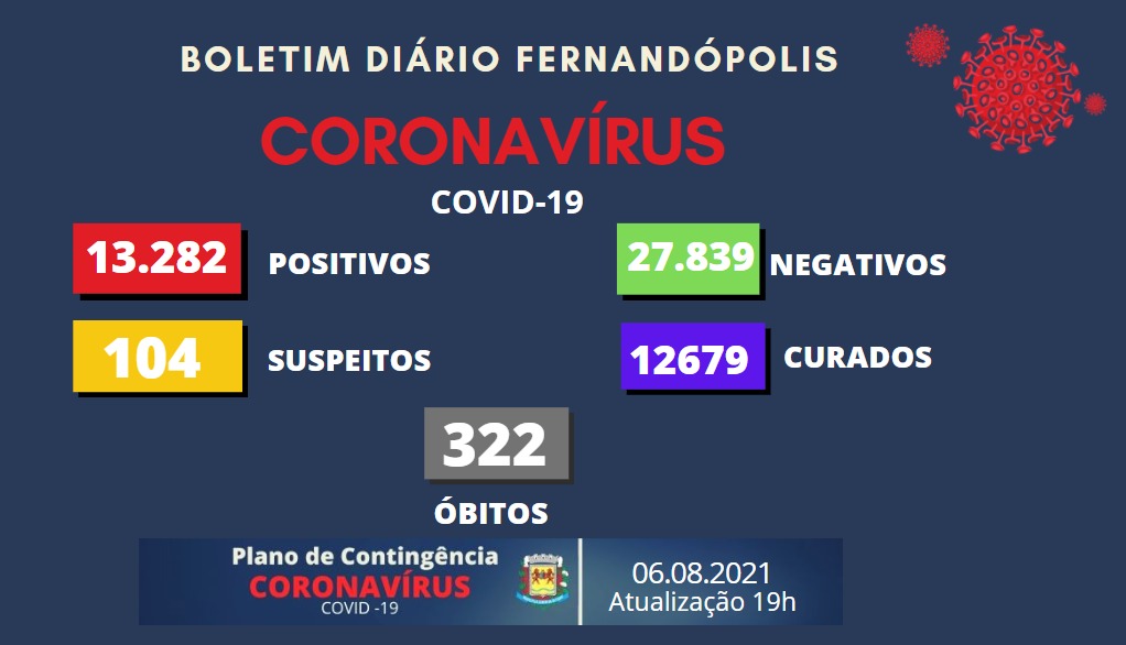 O Boletim Epidemiológico de Fernandópolis desta sexta-feira, 6, traz mais 96 casos positivos para coronavírus. O município chega a 13.282 infectados pela doença.