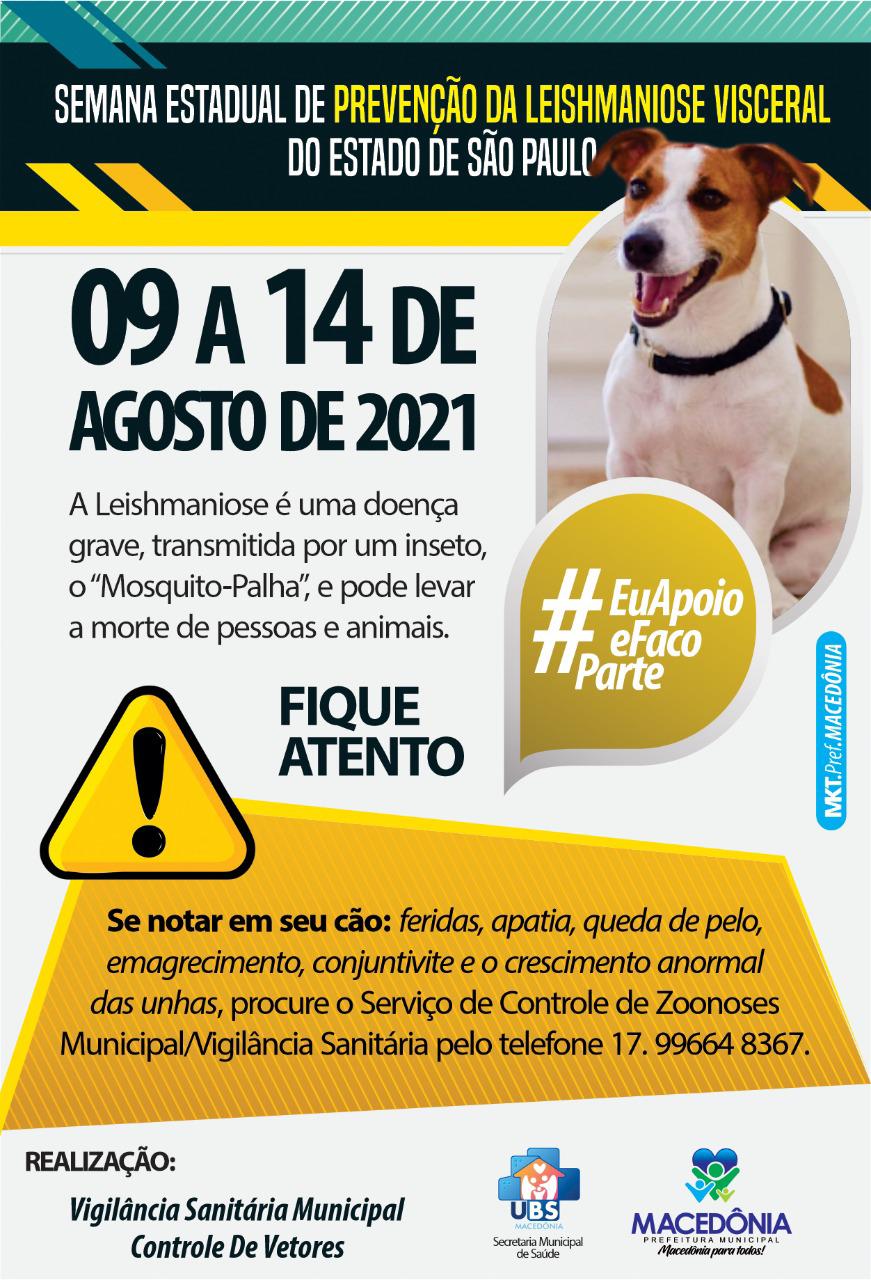 O município de Macedônia em parceria com a Vigilância Sanitária Municipal, Controle de Vetores, Secretaria Municipal de Saúde, promovem a Semana estadual de prevenção da Leishmaniose visceral do estado de São Paulo, do dia 9 a 14 de agosto.