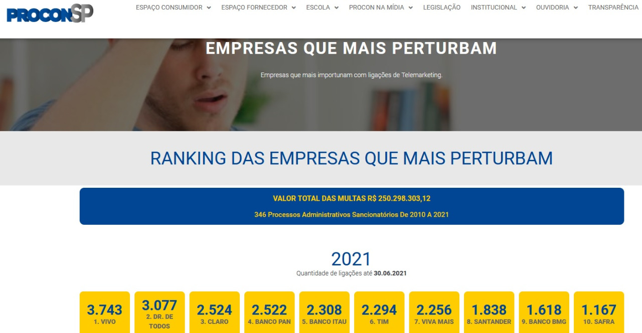 O Procon-SP divulga o ranking dos perturbadores, uma lista das empresas que ligam ou mandam mensagem para o consumidor que está inscrito no cadastro "Não Me Ligue", desrespeitando a escolha de quem não quer receber ofertas de telemarketing. O ranking, que será atualizado mensalmente pela Fundação Procon-SP, tem como objetivo reforçar o respeito à legislação.