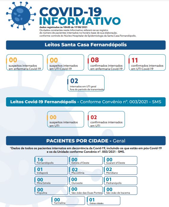 Os dados constantes no informativo referem-se ao registro do número de pacientes internados no horário base de sua elaboração, conforme controle do Núcleo Hospitalar de Epidemiologia da Santa Casa Fernandópolis.