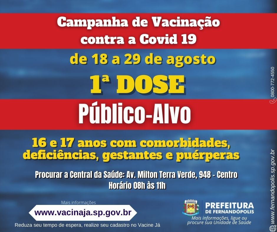 Para receber a dose, basta procurar a Central da Saúde localizada na Av. Milton Terra Verde, 948 – Centro de Fernandópolis das 08h às 11h.