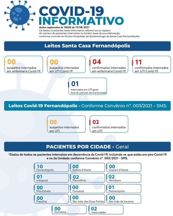 Os dados constantes no informativo referem-se ao registro do número de pacientes internados no horário base de sua elaboração, conforme controle do Núcleo Hospitalar de Epidemiologia da Santa Casa Fernandópolis.