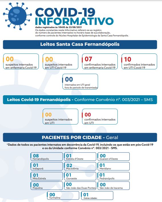 Os dados constantes no informativo referem-se ao registro do número de pacientes internados no horário base de sua elaboração, conforme controle do Núcleo Hospitalar de Epidemiologia da Santa Casa Fernandópolis.