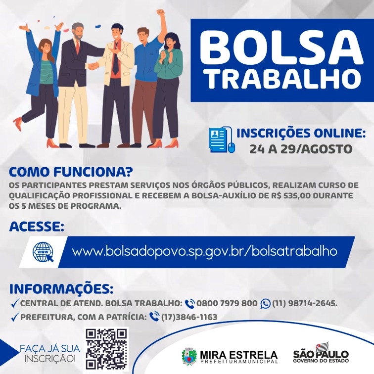 A Prefeitura de Mira Estrela aderiu ao Programa Bolsa Trabalho do Governo Estadual que tem como objetivo proporcionar ocupação, qualificação profissional e renda aos cidadãos em situação de vulnerabilidade social.