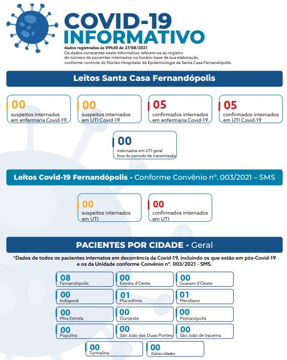 Os dados constantes no informativo referem-se ao registro do número de pacientes internados no horário base de sua elaboração, conforme controle do Núcleo Hospitalar de Epidemiologia da Santa Casa Fernandópolis.