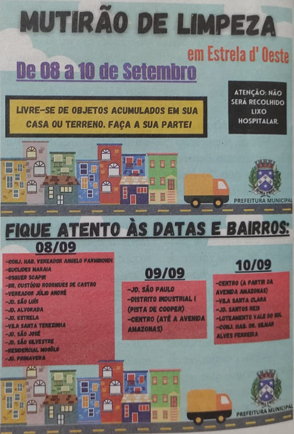 A Administração Municipal de Estrela d’Oeste, município localizado a 16 quilômetros de Fernandópolis, programou para o mês de setembro mutirão de limpeza, que rá percorrer vários bairros.