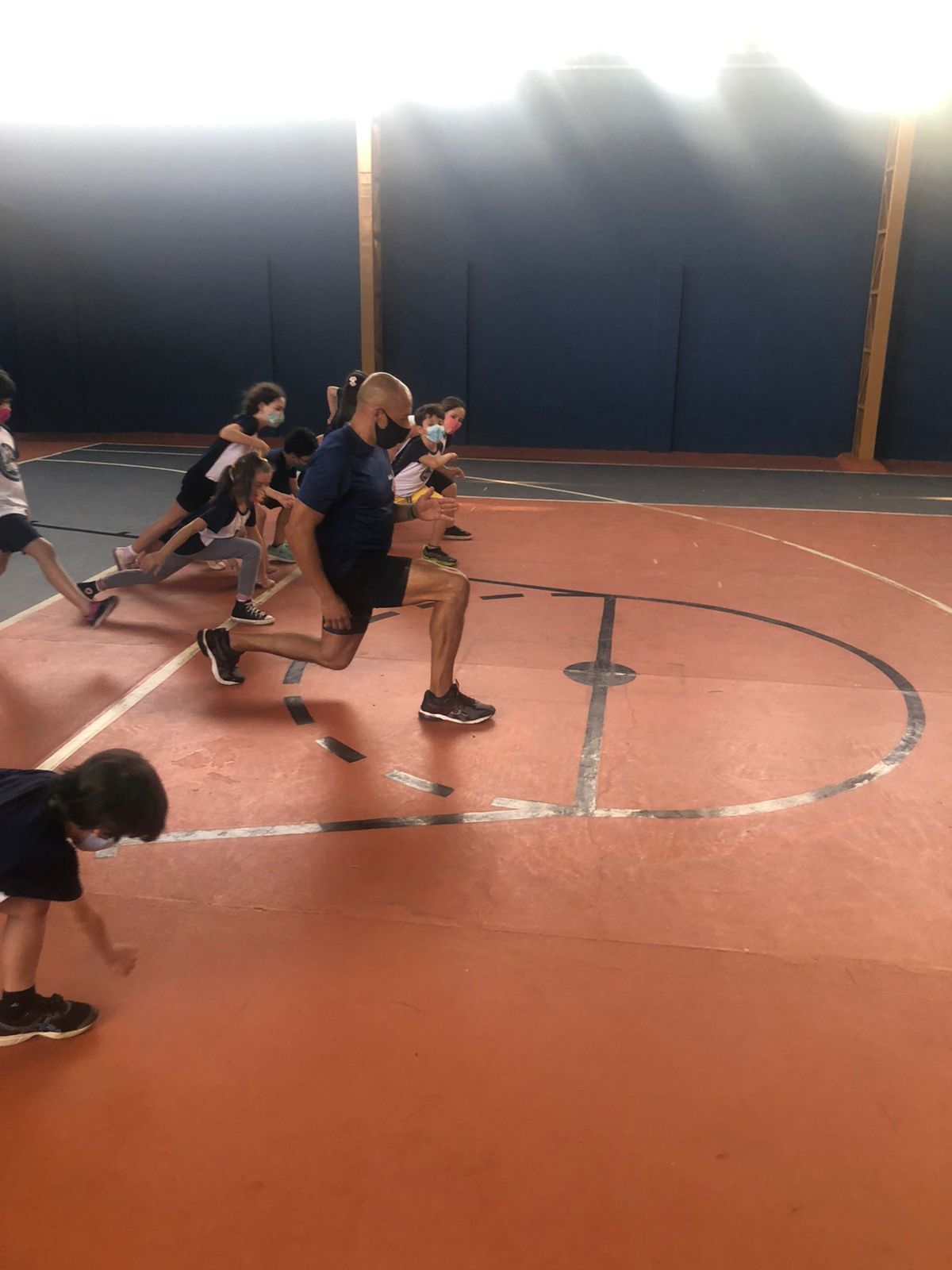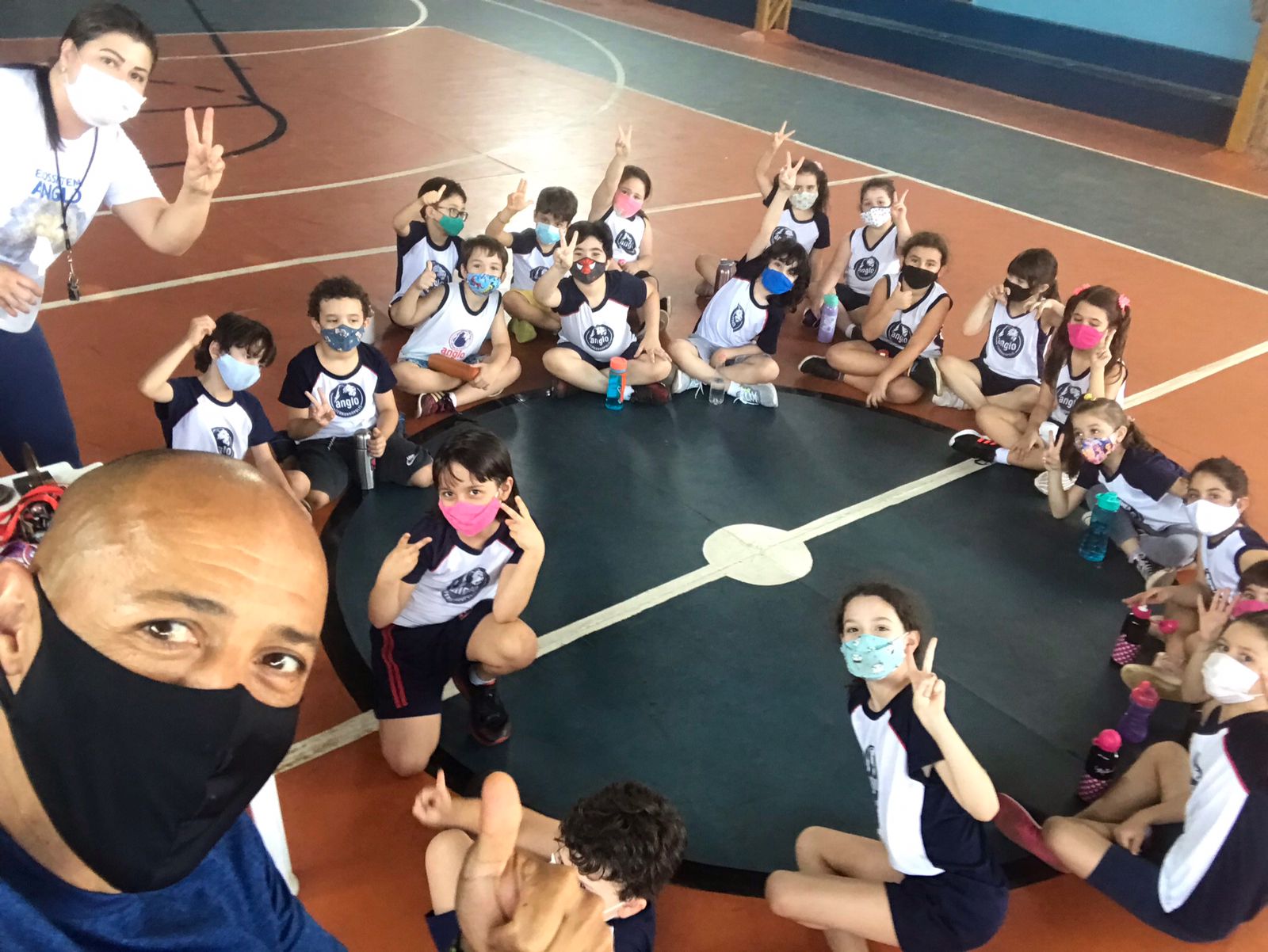 Fernando juntamente com as crianças durante a palestra sobre atletismo
