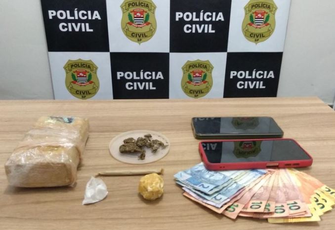 Foram apreendidos cerca de 500 gramas de maconha, 30 gramas de cocaína, dinheiro e dois celulares