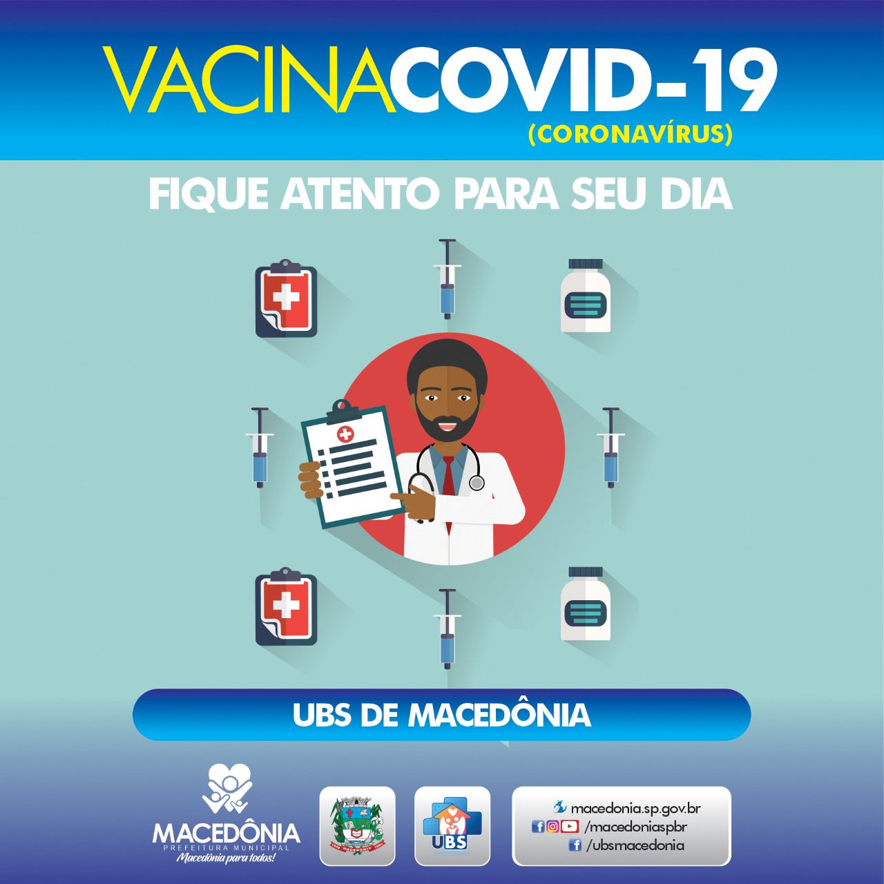A Unidade Básica de Saúde de Macedônia convoca adolescentes de 13 a 14 anos para receberem a vacina contra a Covid-19.