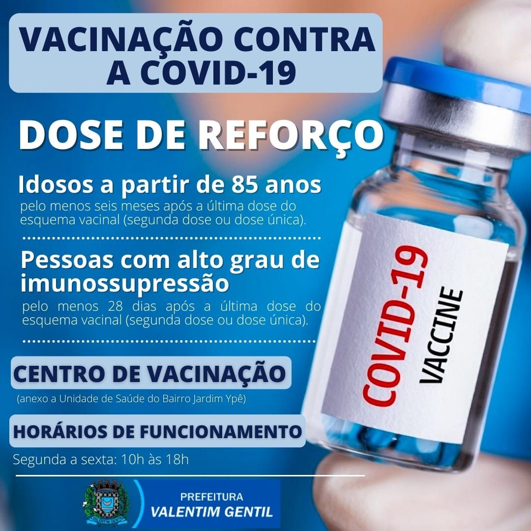 A Secretaria de Saúde da Prefeitura de Valentim Gentil inicia nesta quinta-feira (09/09) a aplicação da dose de reforço da vacina contra a Covid-19 em idosos a partir de 85 anos. Esta faixa etária deve procurar o Centro de Vacinação que funciona em anexo à Unidade de Saúde do Ypê, das 10h às 18h.