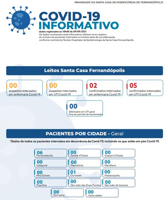 Os dados constantes no informativo referem-se ao registro do número de pacientes internados no horário base de sua elaboração, conforme controle do Núcleo Hospitalar de Epidemiologia da Santa Casa Fernandópolis.