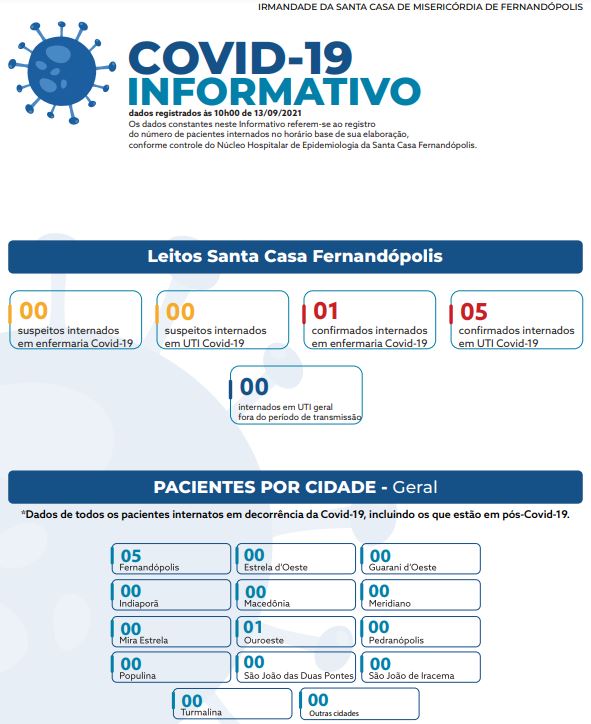 A UTI própria para coronavírus da Santa Casa de Fernandópolis tem nesta segunda-feira, 13 de setembro, 05 pacientes confirmados para doença internados na ala. Mais um paciente confirmado com a doença está internado na enfermaria.