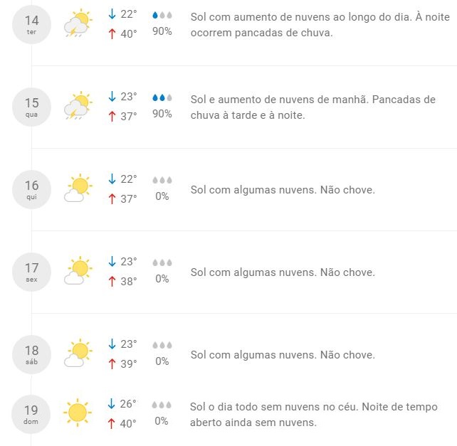 No restante da semana não deve chover, mas o calor continuara firme, com temperaturas variando entre 22° na quinta e 40° no domingo.