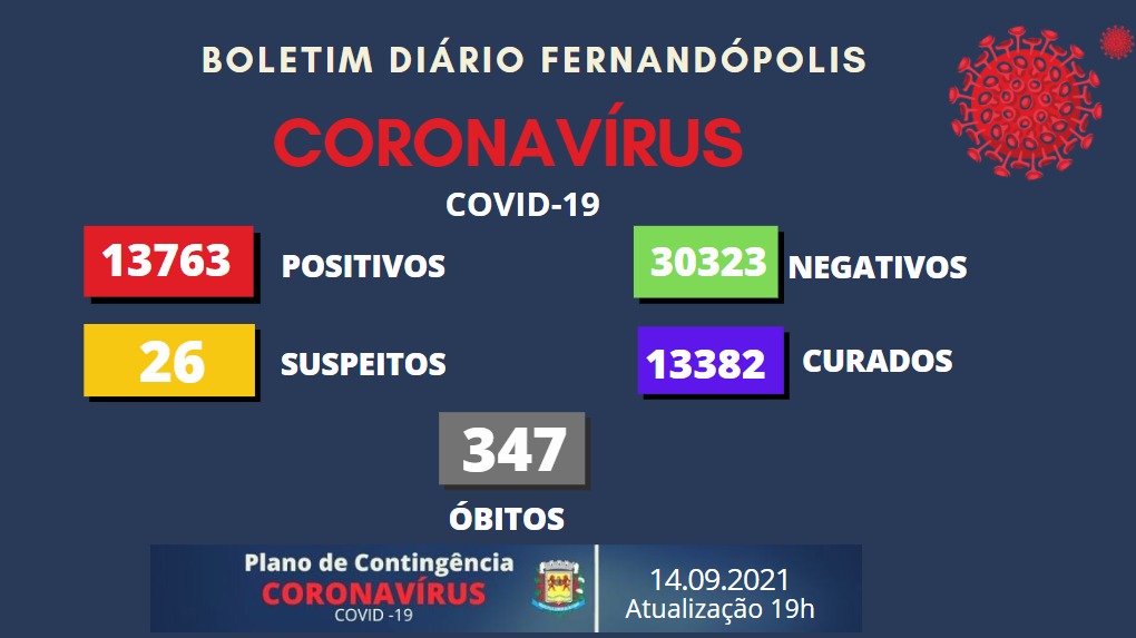 Até o momento, 347 pessoas já morreram devido a complicações da Covid-19 em Fernandópolis. O último óbito foi registrado no dia 8 de setembro.