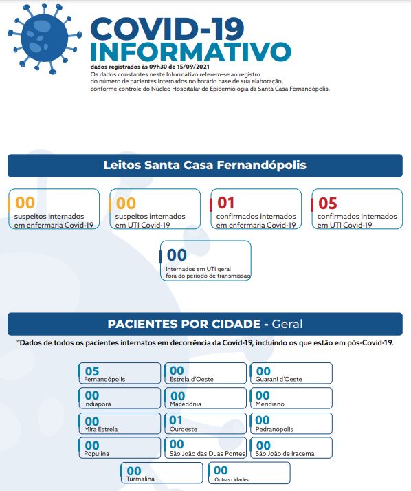 A UTI própria para coronavírus da Santa Casa de Fernandópolis tem nesta quarta-feira, 15 de setembro, 05 pacientes confirmados para doença internados na ala. Mais um paciente confirmado com a doença está internado na enfermaria.
