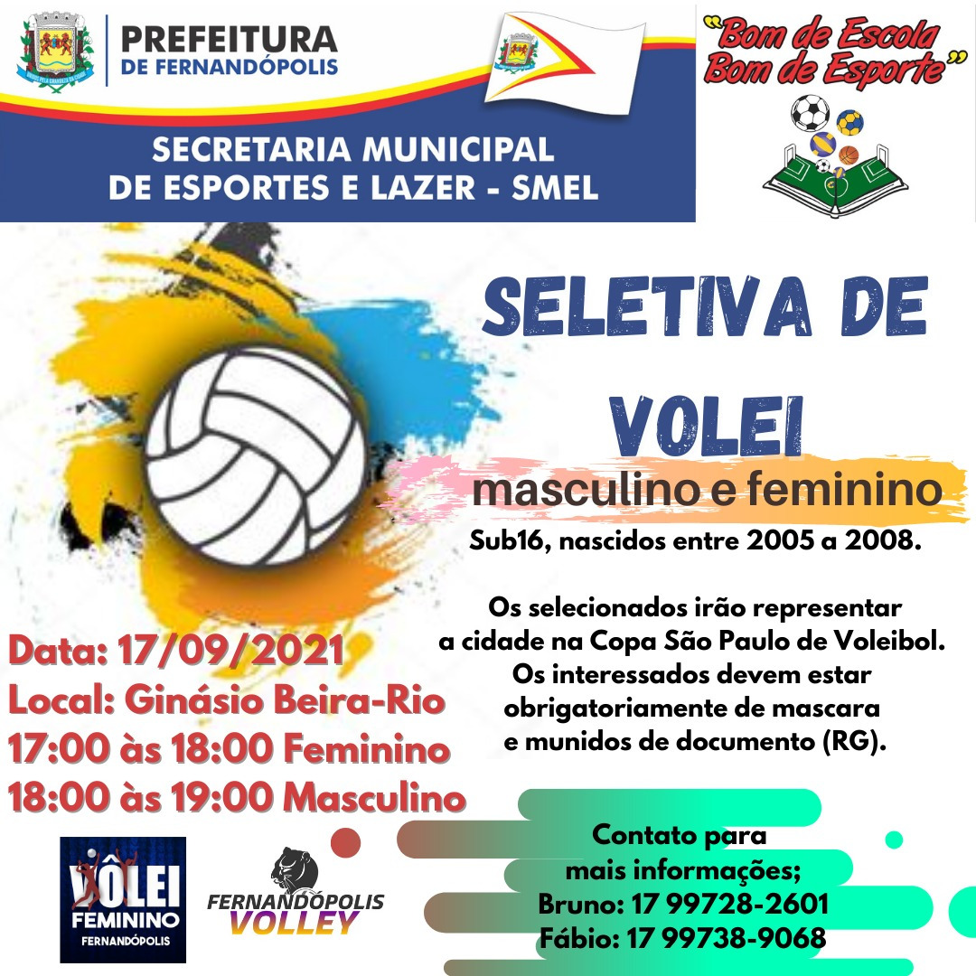 A SMEL – Secretaria Municipal de Esportes e Lazer, realizará, na próxima sexta-feira, dia 17, uma seletiva de voleibol masculino e feminino para ingresso nas equipes do Sub-16 da cidade.