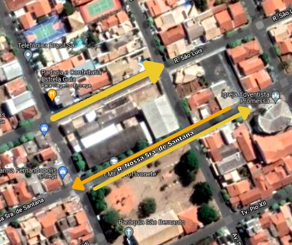 A Secretaria Municipal de Trânsito de Fernandópolis informa que trechos das ruas São Luís e Nossa Senhora de Santana passam por alteração no sentido de circulação e inclusão de mão dupla de direção. O principal objetivo é garantir mais segurança aos alunos da escola municipal Ivonete Amaral da Silva Rosa, que agora passam a entrar e sair pelo portão da rua São Luís e melhorar o fluxo de veículos para a ligação entre bairros.