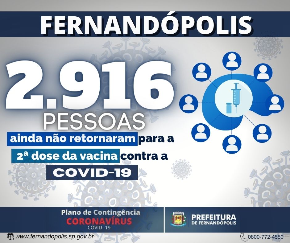 A Secretaria Municipal de Saúde trabalha com a busca ativa dos moradores de Fernandópolis que estão com a 2ª dose da vacina contra Covid-19 em atraso. No município, 2.916 pessoas estão aptas a tomarem a 2ª dose, mas até o momento não procuraram suas unidades de saúde. Desse total, o maior número de abstenção é de pessoas com 50 a 59 anos de idade.