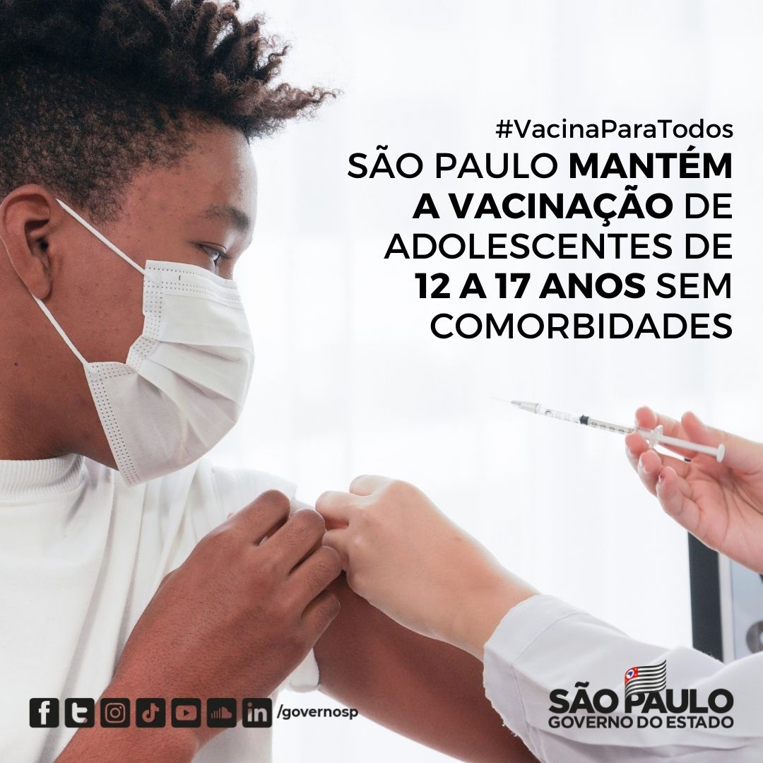 Governo estadual confirma a manutenção da vacinação de adolescentes entre 12 e 17 anos sem comorbidades (Foto: Divulgação/Governo de SP)