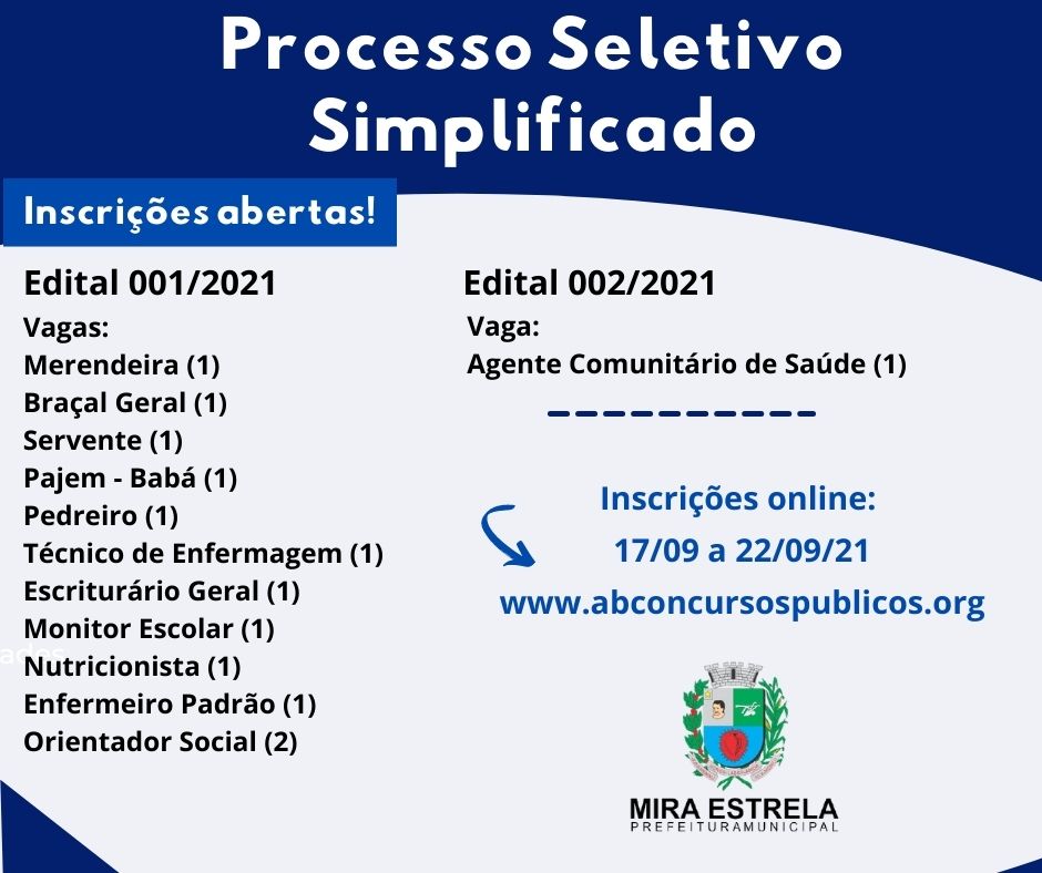 Estão abertas as inscrições para o Processo Seletivo Simplificado da Prefeitura Municipal de Mira Estrela, do Edital 001/2021 para a contratação imediata e temporária do preenchimento de vagas dos cargos de merendeira (1), braçal geral (1), servente (1), babá (1), pedreiro (1), técnico de enfermagem (1), escriturário geral (1), monitor escolar (1), nutricionista (1), enfermeiro padrão (1), orientador social (2) e do Edital 002/2021 para a contratação de agente comunitário de saúde (1).