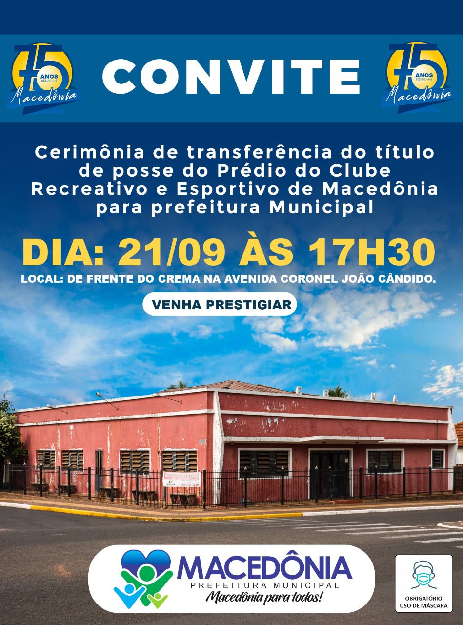 O município de Macedônia convida a todos para a Cerimônia de transferência do título de posse do Prédio do Clube Recreativo e Esportivo de Macedônia para a Prefeitura Municipal.