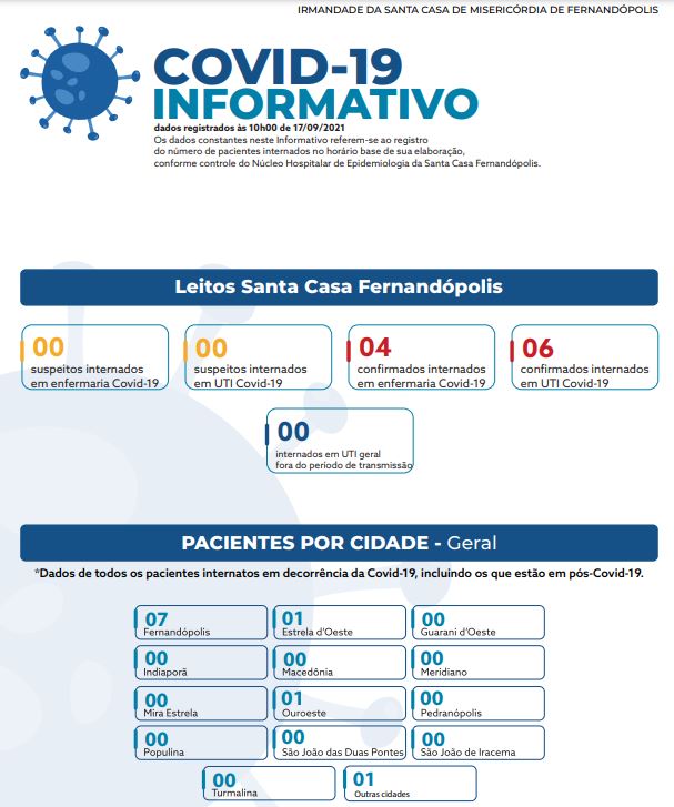 Os dados constantes no informativo referem-se ao registro do número de pacientes internados no horário base de sua elaboração, conforme controle do Núcleo Hospitalar de Epidemiologia da Santa Casa de Fernandópolis.