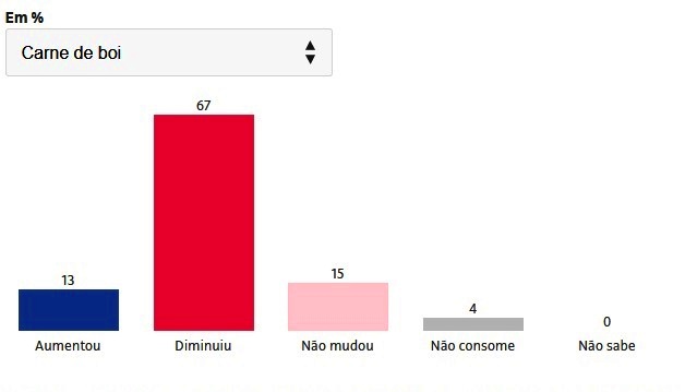 Pesquisa Datafolha realizada nos últimos dias 13 a 15 de setembro, com 3667 entrevistados em 190 municípios mostra que 85% dos brasileiros reduziram o consumo de algum item alimentício desde o início do ano, com destaque para carne de boi, refrigerantes, sucos, laticínios e pães. No sentido contrário, cresceu o consumo de ovo como proteína substituta.